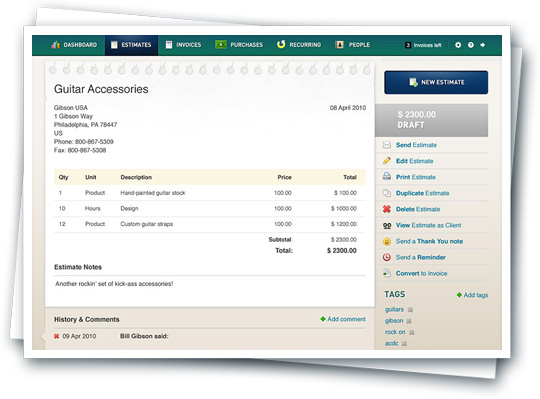 Blinksale te permite mandar facturas y seguir su pago de forma sencilla. Personalmente no he usado la aplicación, pero ver el aspecto tan mimado de su interfaz -en la imagen de ejemplo- realmente transmite una experiencia de uso muy agradable.